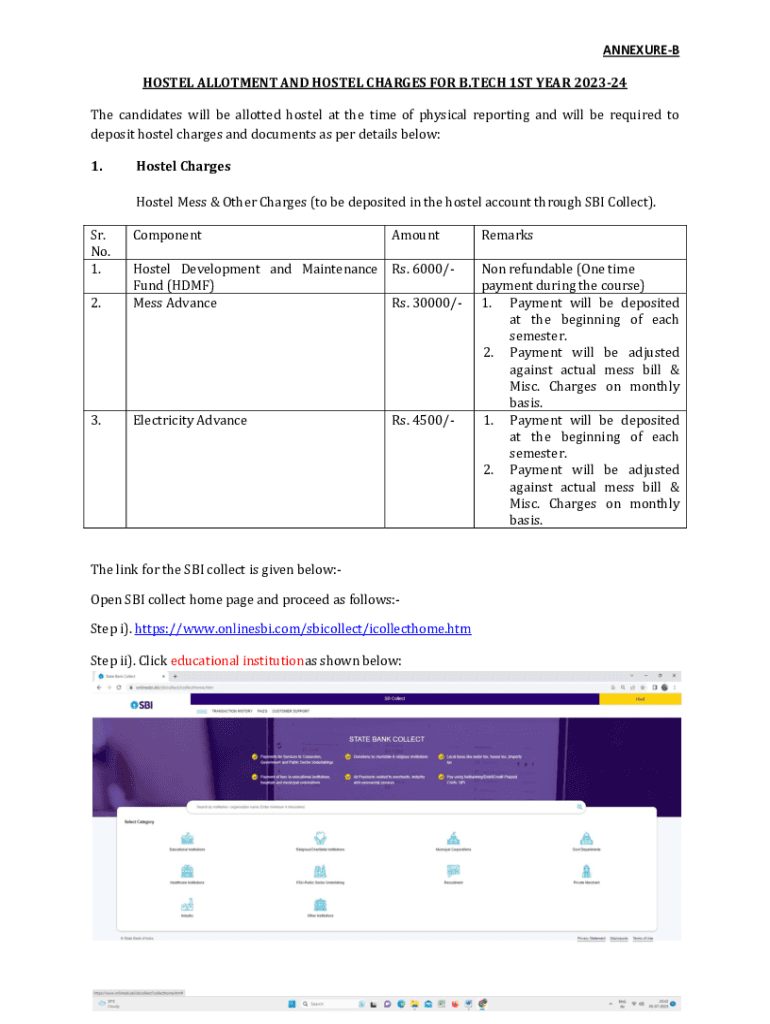ANNEXED HOSTEL ALLOTMENT AND HOSTEL CHARGES FOR B.TECH 1ST YEAR 202324 The candidates will be allotted hostel at the time of physical reporting and will be required to deposit hostel charges and documents