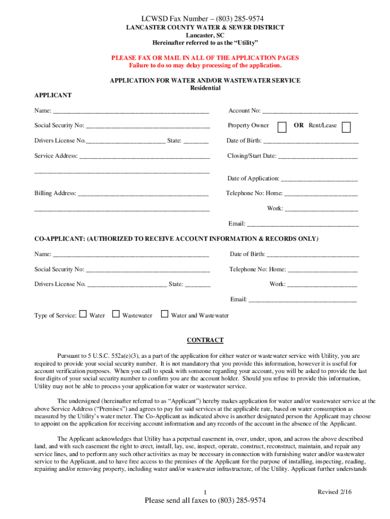 LC WSD Fax Number (803) 2859574 LANCASTER COUNTY WATER & SEWER DISTRICT Lancaster, SC Hereinafter referred to as the Utility PLEASE FAX OR MAIL IN All the APPLICATION PAGES Failure to do so may delay