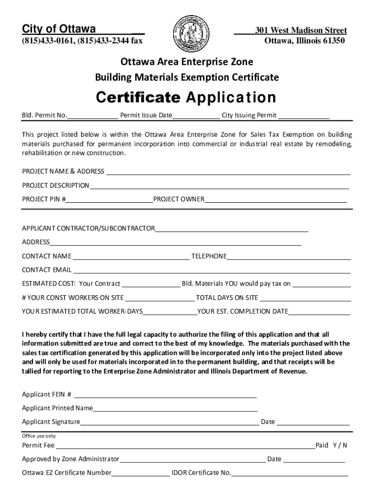 City of Ottawa___ (815)4330161, (815)4332344 fax___301 West Madison Street Ottawa, Illinois 61350Ottawa Area Enterprise Zone Building Materials Exemption CertificateCertificate Application BLD. Permit