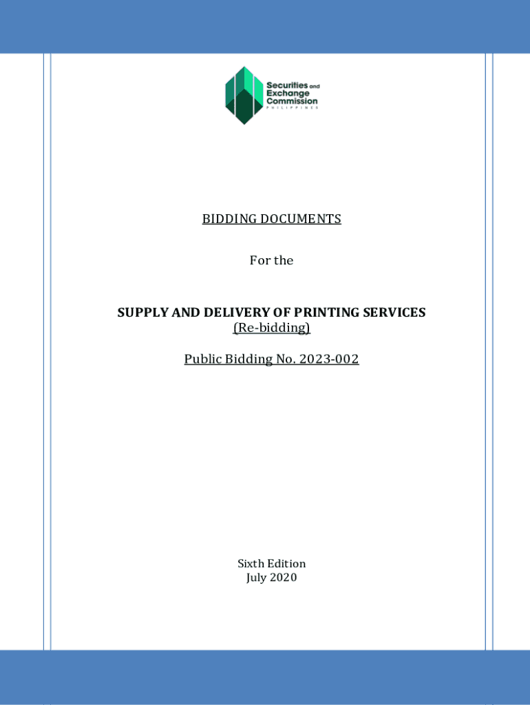 BIDDING DOCUMENTS For resupply AND DELIVERY OF PRINTING SERVICES (Rebidding) Public Bidding No. 2023002Sixth Edition July 20201Preface These Philippine Bidding Documents (Pads) for the procurement