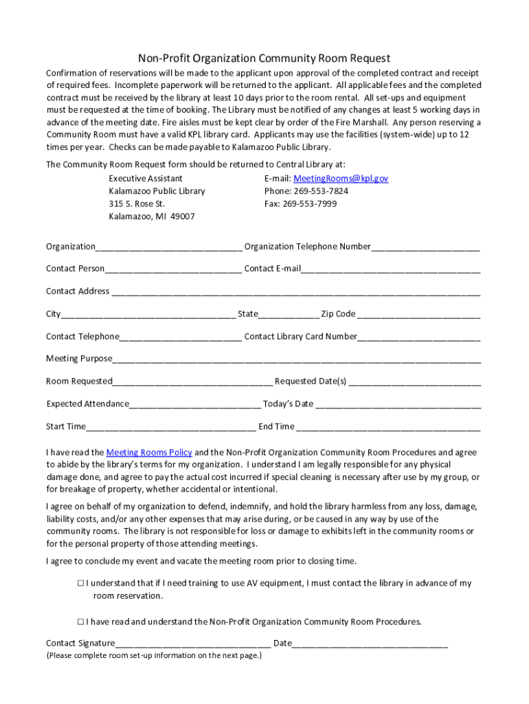 Nonprofit Organization Community Room Request Confirmation of reservations will be made to the applicant upon approval of the completed contract and receipt of required fees. Incomplete paperwork