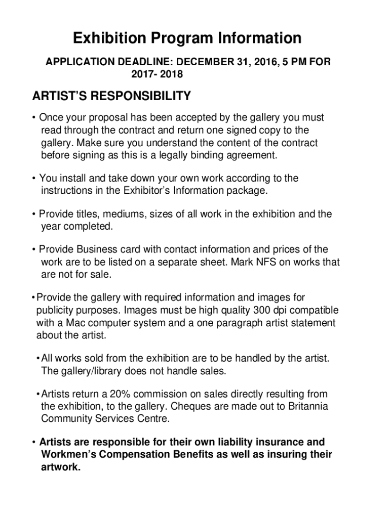 Exhibition Program Information APPLICATION DEADLINE: DECEMBER 31, 2016, 5 PM FOR 2017 2018ARTISTS RESPONSIBILITY Once your proposal has been accepted by the gallery you must read through the contract