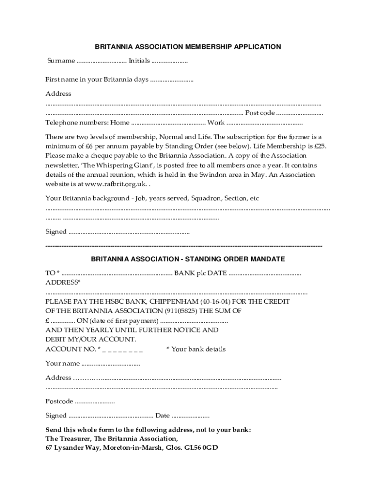 The britannia association membership application is a form that individuals or organizations must complete in order to become members of the Britannia Association.