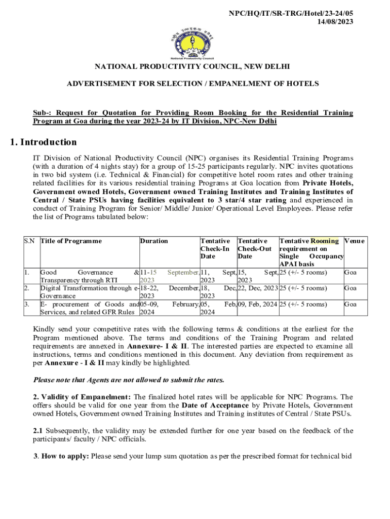 NPC/HQ/IT/STAG/Hotel/2324/05 14/08/2023NATIONAL PRODUCTIVITY COUNCIL, NEW DELHI ADVERTISEMENT FOR SELECTION / EMBANKMENT OF Hotels: Request for Quotation for Providing Room Booking for the Residential