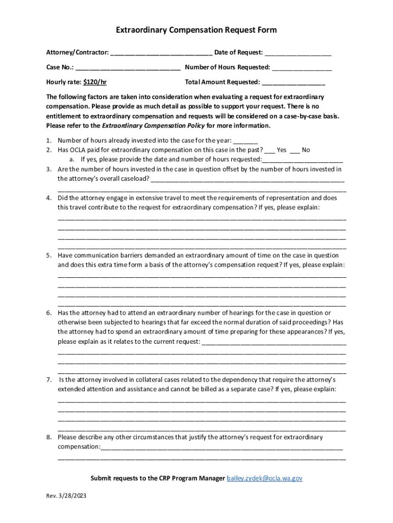 Extraordinary Compensation Request Form Attorney/Contractor: ___ Date of Request: ___ Case No.: ___ Number of Hours Requested: ___ Hourly rate: $120/total Amount Requested: ___The following factors