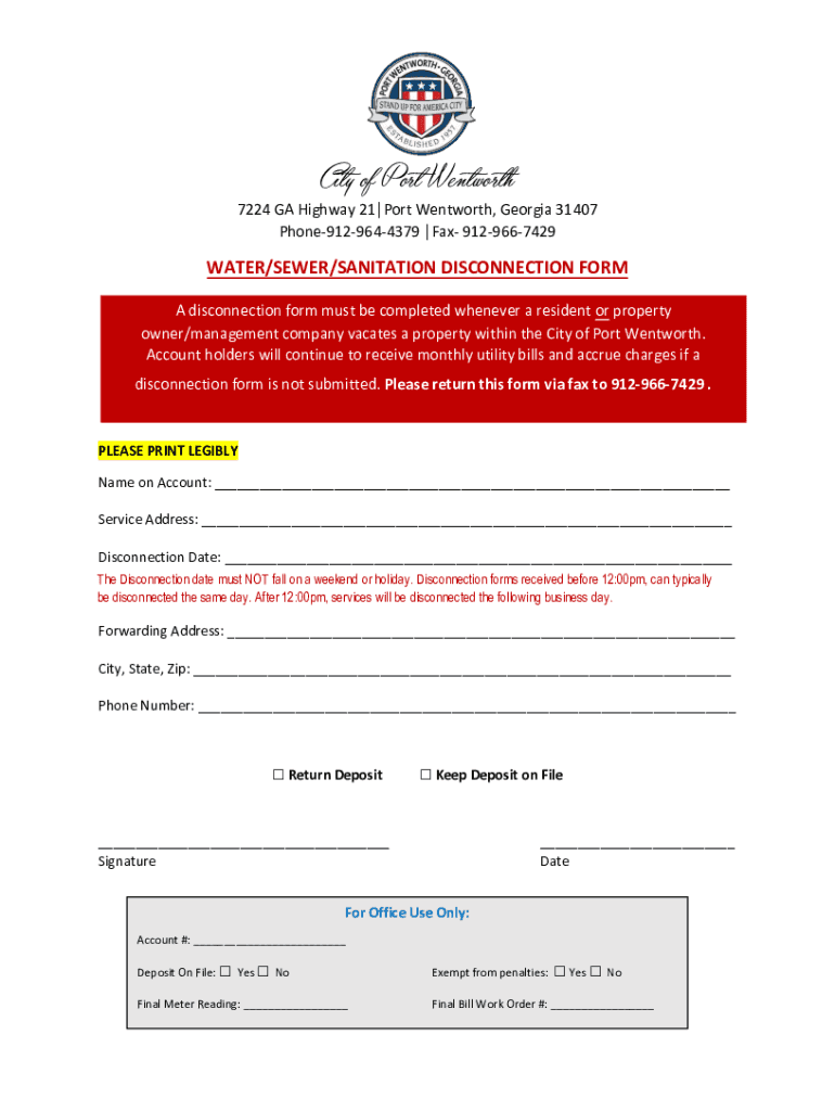 City of Port Wentworth 7224 GA Highway 21Port Wentworth, Georgia 31407 Phone9129644379 Fax 9129667429WATER/SEWER/SANITATION DISCONNECTION From A disconnection form must be completed whenever a resident