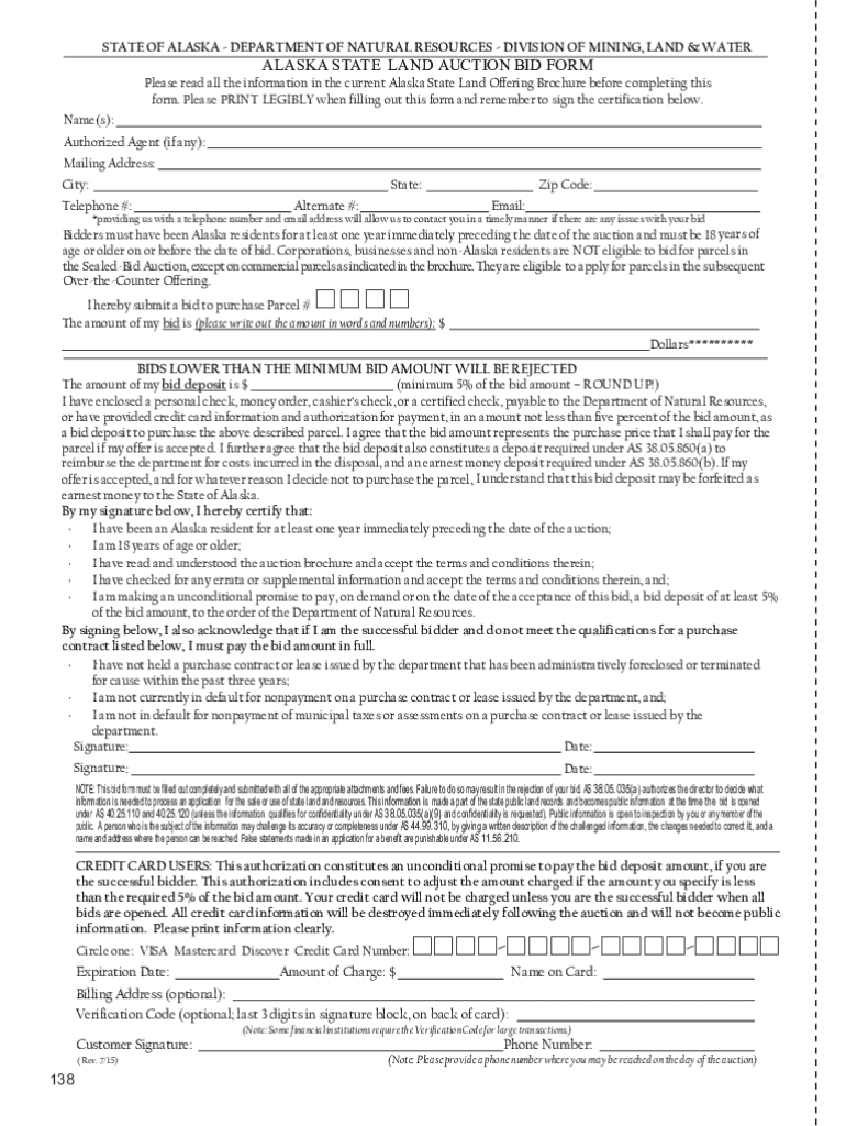 STATE OF ALASKA DEPARTMENT OF NATURAL RESOURCES DIVISION OF MINING, LAND & WATERALASKA STATE LAND AUCTION BID Formulas read all the information in the current Alaska State Land Offering Brochure before