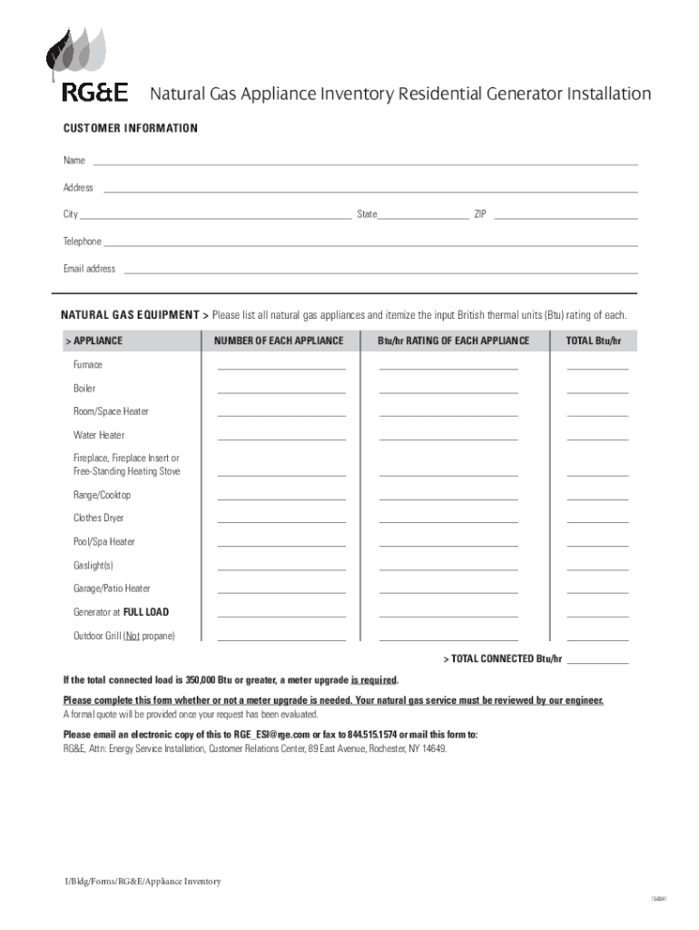 Natural Gas Appliance Inventory Residential Generator Installation CUSTOMER INFORMATION Name ___ Address ___ City ___ State___ ZIP ___ Telephone ___ Email address ___NATURAL GAS EQUIPMENT Please list