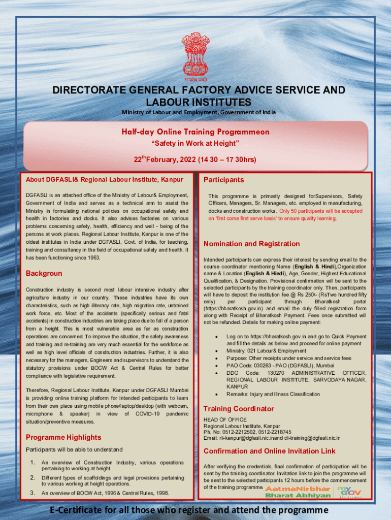 DIRECTORATE GENERAL FACTORY ADVICE SERVICE AND Labor INSTITUTES Ministry of Labor and Employment, Government of IndiaHalfday Online Training Programmed Safety in Work at Height 22thFebruary, 2022