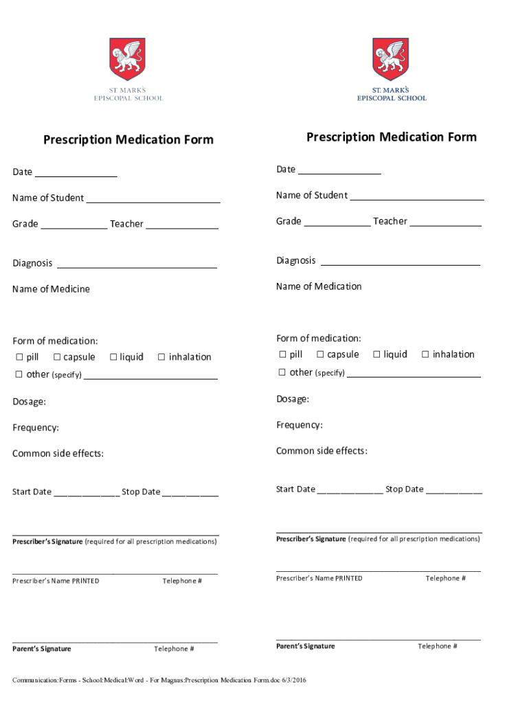 PrescriptionMedicationForm PrescriptionMedicationFormDate___ NameofStudent___ Grade___Teacher___ Diagnosis___ NameofMedicineDate___ NameofStudent___ Grade