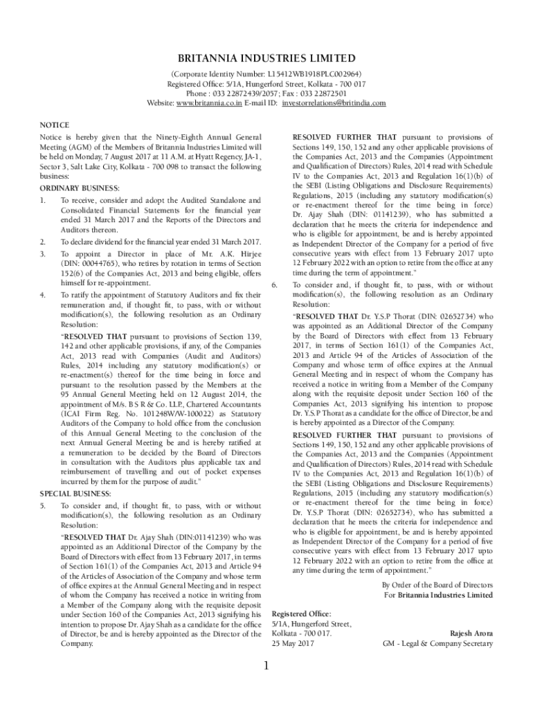Get the free Notice of 103rd AGM of Britannia Industries Limited