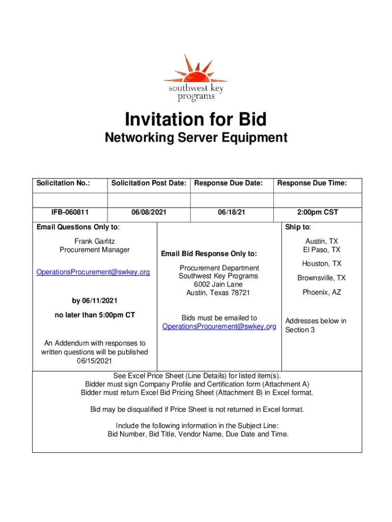 Networking Server EquipmentSolicitation No.:Solicitation Post Date:IFB06081106/08/2021Response Due Date:06/18/21Email Questions Only to: