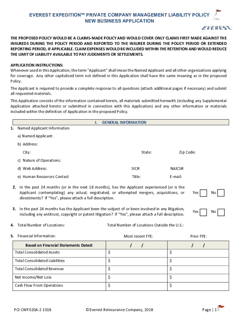 EVEREST EXPEDITION PRIVATE COMPANY MANAGEMENT LIABILITY POLICY NEW BUSINESS APPLICATION THE PROPOSED POLICY WOULD BE A CLASSMATE POLICY AND WOULD COVER ONLY CLAIMS FIRST MADE AGAINST THE INSUREDS