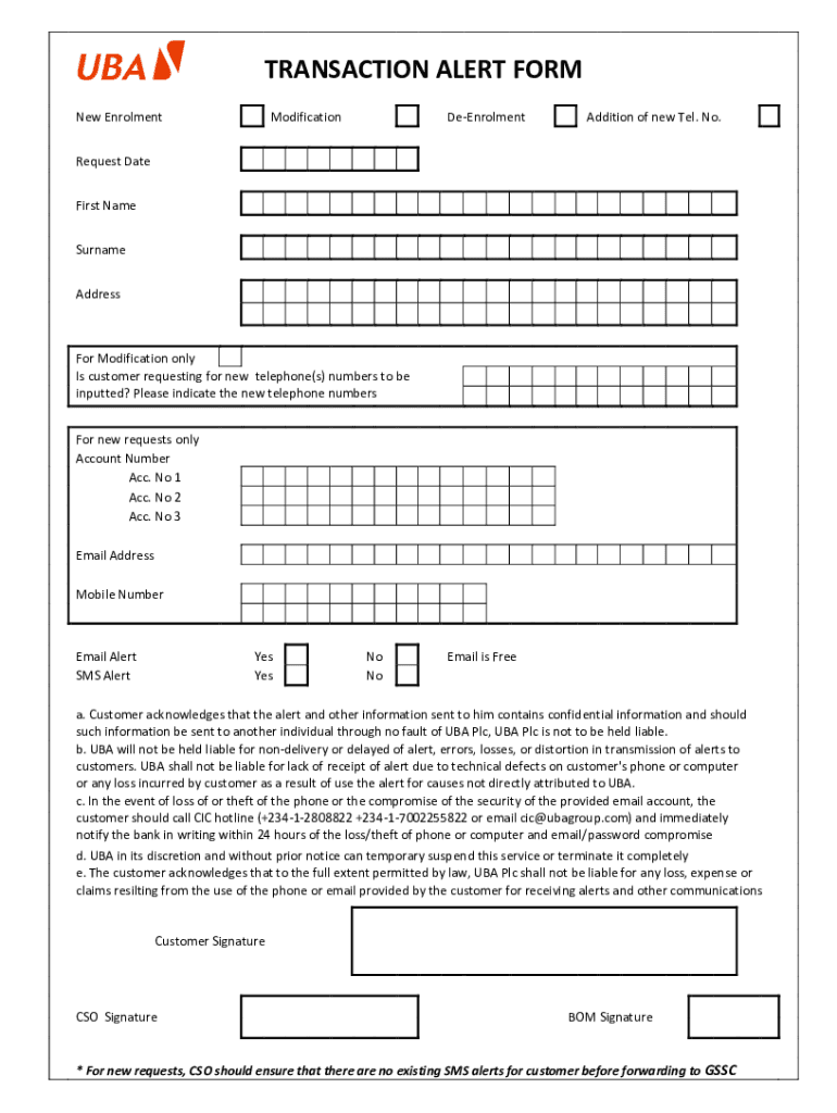 Obtain the transaction alert form from a UBA branch or download it from the UBA website.
