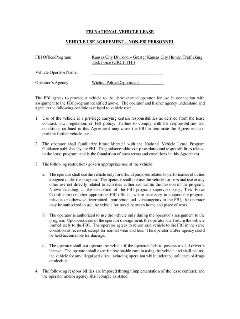 FBI NATIONAL VEHICLE LEASE VEHICLE USE AGREEMENT NONFBI PERSONNEL FBI Office/Program:Kansas City Division Greater Kansas City Human Trafficking Task Force (GKCHTTF)Vehicle Operator Name:___Operators