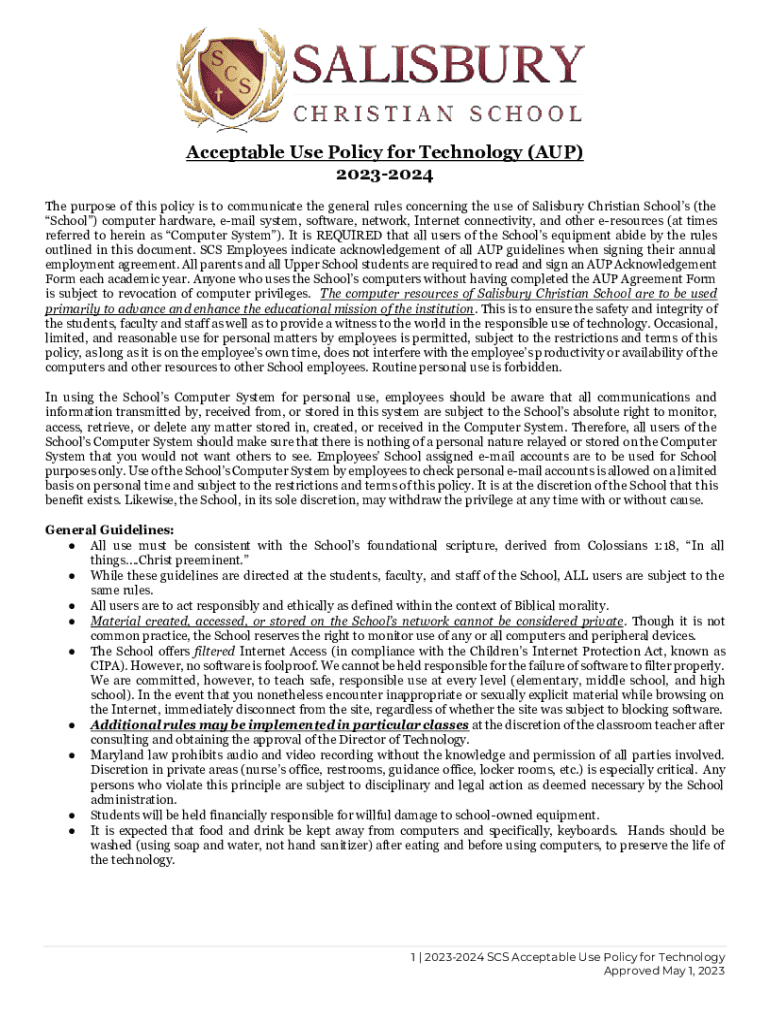 Acceptable Use Policy for Technology (AUP) 20232024 The purpose of this policy is to communicate the general rules concerning the use of Salisbury Christian Schools (the School) computer hardware,
