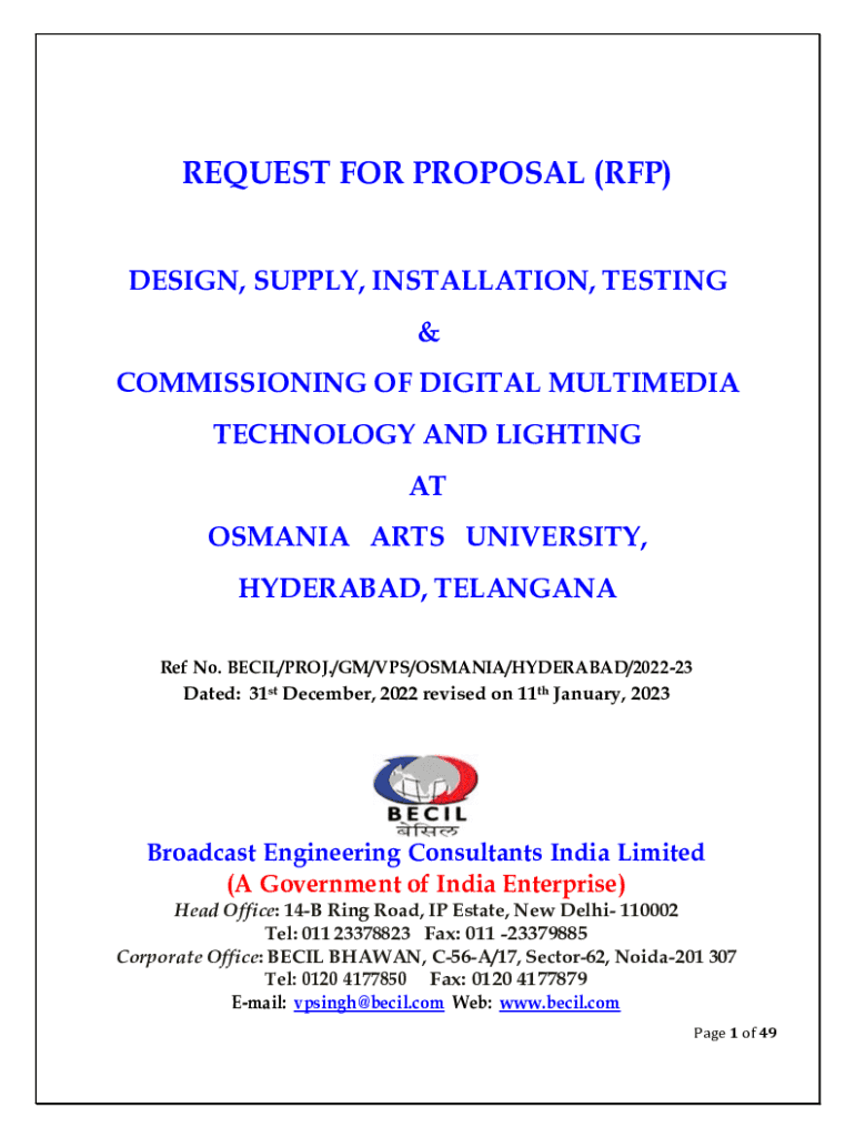 REQUEST FOR PROPOSAL (RFP) DESIGN, SUPPLY, INSTALLATION, TESTING & COMMISSIONING OF DIGITAL MULTIMEDIA TECHNOLOGY AND LIGHTING AT OSM ANIA ARTS UNIVERSITY, HYDERABAD, TELANGANA Ref No. CECIL/PRO./GM/VPS/OSM