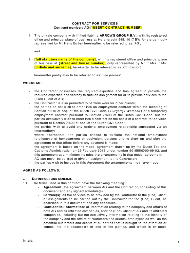 CONTRACT FOR SERVICES Contract number: AG[INSERT CONTRACT NUMBER] 1. The private company with limited liability ARROWS GROUP B.V., with its registered office and principal place of business at Herengracht
