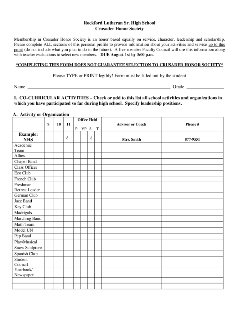 Rockford Lutheran Sr. High School Crusader Honor Society Membership in Crusader Honor Society is an honor based equally on service, character, leadership and scholarship. Please complete ALL sections