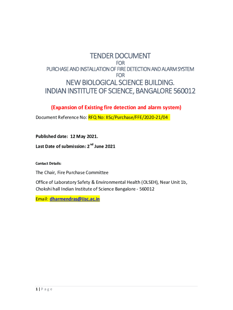 TENDER DOCUMENT PURCHASE AND INSTALLATION OF FIRE DETECTION AND ALARM SYSTEM FORMER BIOLOGICAL SCIENCE BUILDING. INDIAN INSTITUTE OF SCIENCE, BANGALORE 560012 (Expansion of Existing fire detection