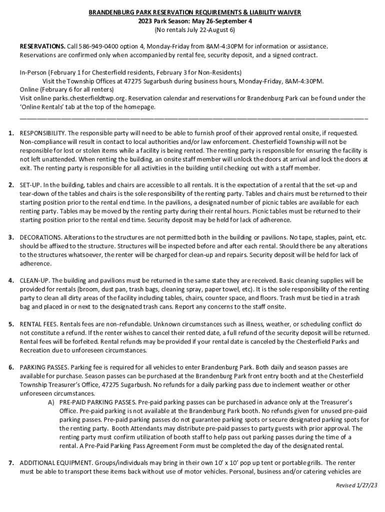 BRANDENBURG PARK RESERVATION REQUIREMENTS & LIABILITY WAIVER 2023 Park Season: May 26September 4 (No rentals July 22August 6) RESERVATIONS. Call 5869490400 option 4, Monday Friday from 8AM4:30PM for