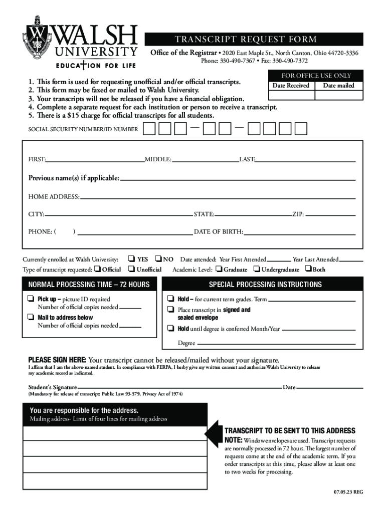 TRANSCRIPT REQUEST FORM Office of the Registrar 2020 East Maple St., North Canton, Ohio 447203336 Phone: 3304907367 Fax: 3304907372FOR OFFICE USE ONLY Date mailed1. This form is used for requesting