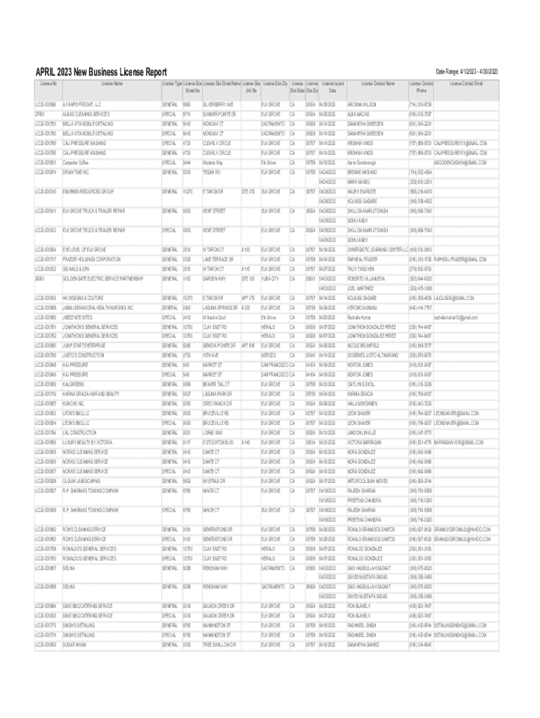 APRIL 2023 New Business License Report License Name Date Range: 4/1/2023 4/30/2023License Type License Site Street Name License Site City License Street No Unit No Site State Site License Issued Dateline