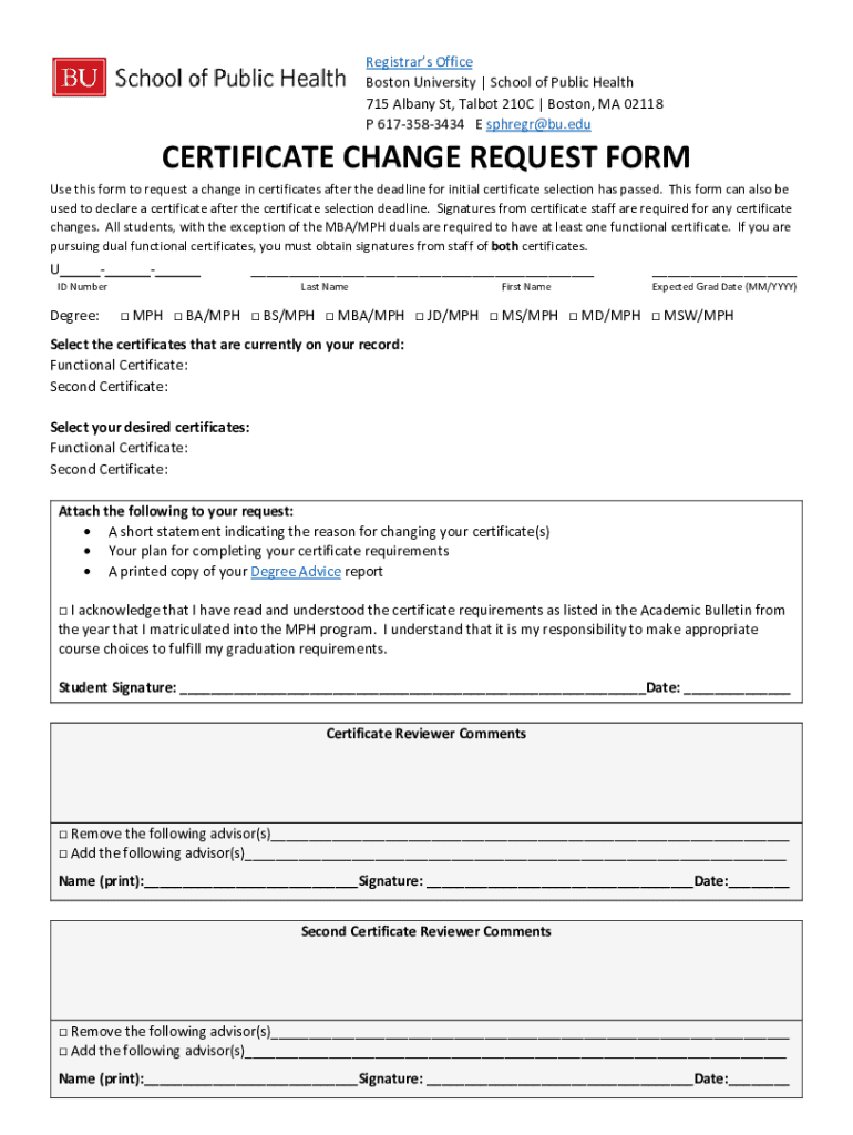 Registrars Office Boston University | School of Public Health 715 Albany St, Talbot 210C | Boston, MA 02118 P 6173583434 E sphregr@bu.eduCERTIFICATE CHANGE REQUEST Forms this form to request a change