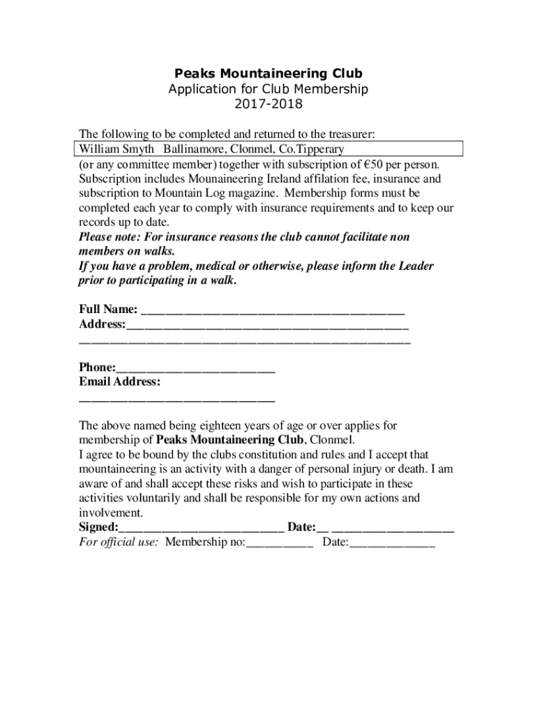 Peaks Mountaineering Club Application for Club Membership 20172018 The following to be completed and returned to the treasurer: William Smith Baltimore, Colonel, Co. Tipperary (or any committee member)