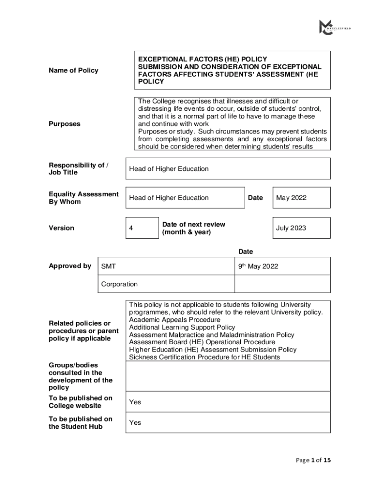 Name of PolicyEXCEPTIONAL FACTORS (HE) POLICY SUBMISSION AND CONSIDERATION OF EXCEPTIONAL FACTORS AFFECTING STUDENTS ASSESSMENT (HE POLICYPurposesThe College recognizes that illnesses and difficult