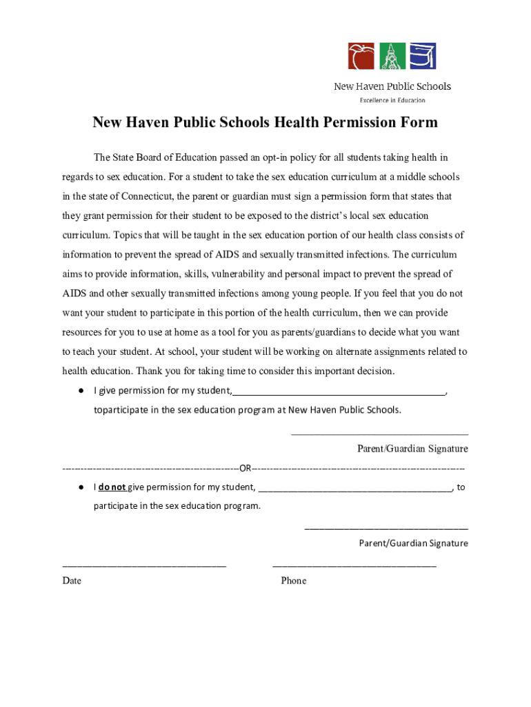 New Haven Public Schools Health Permission Form The State Board of Education passed an option policy for all students taking health in regard to sex education. For a student to take the sex education