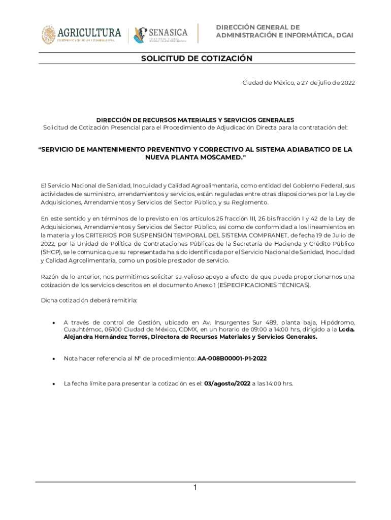 Ciudad de Mxico, a 27 de Julio de 2022DIRECCIN DE RECUR SOS MATERIALS Y SERVICES GENERALS
