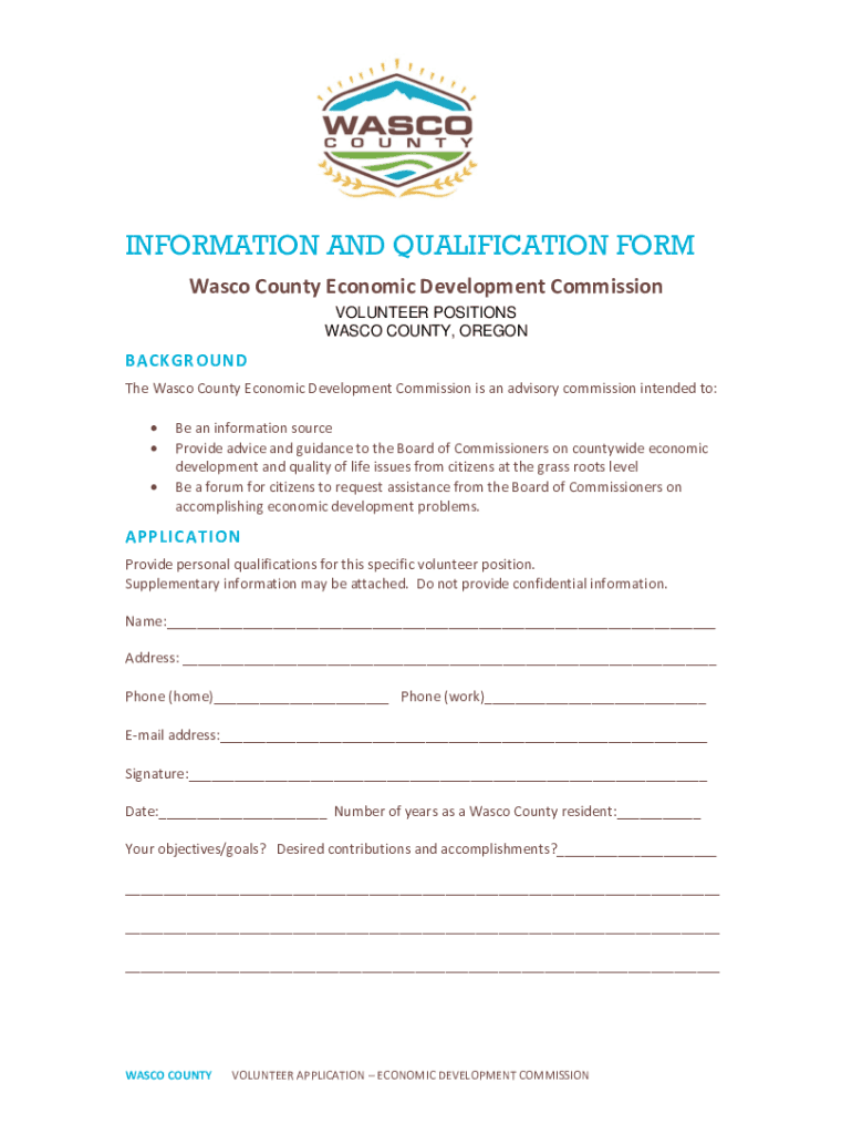 INFORMATION AND QUALIFICATION FORM Waco County Economic Development Commission VOLUNTEER POSITIONS WACO COUNTY, OREGONBACKGROUND The Waco County Economic Development Commission is an advisory commission