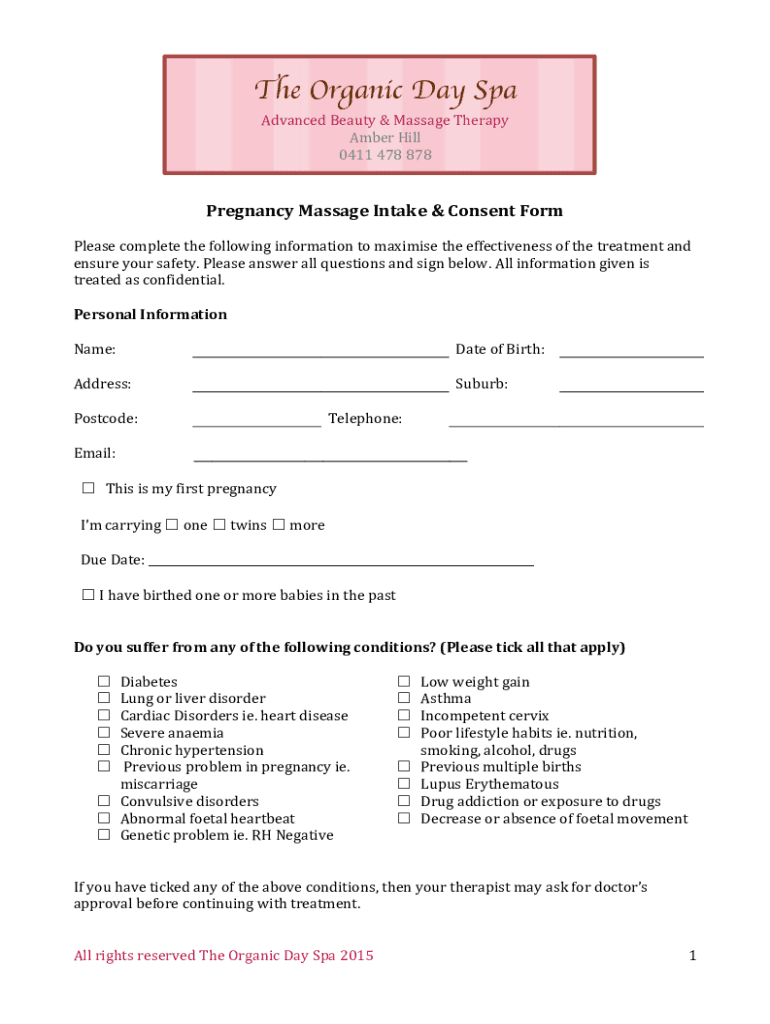 The Organic Day SpaAdvancedBeauty&MassageTherapy Amber Hill 0411478878 PregnancyMassageIntake&ConsentForm Pleasecompletethefollowinginformationtomaximisetheeffectivenessofthetreatmentand ensureyoursafety.