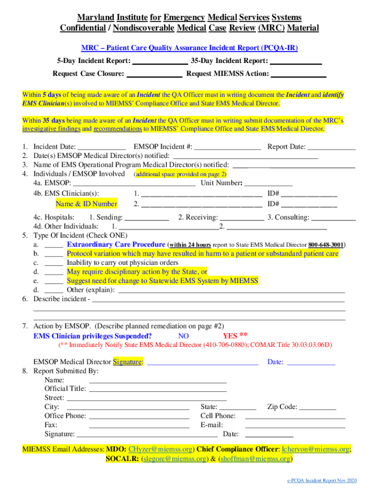 Maryland Institute for Emergency Medical Services Systems Confidential / Nonrecoverable Medical Case Review (MRC) Material MRC Patient Care Quality Assurance Incident Report (PAIR) 5Day Incident Report: