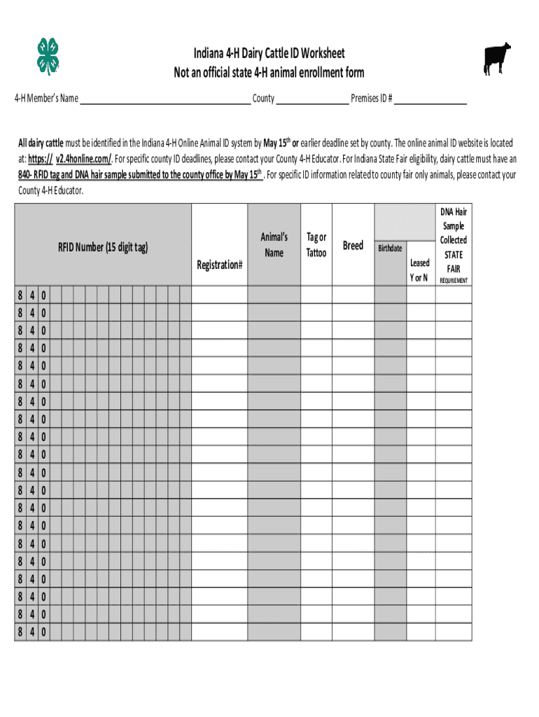 Indiana 4H Dairy Cattle ID Worksheet Not an official state 4H animal enrollment form 4H Members Name ___ County ___ Premises ID # ___ All dairy cattle must be identified in the Indiana 4H Online Animal