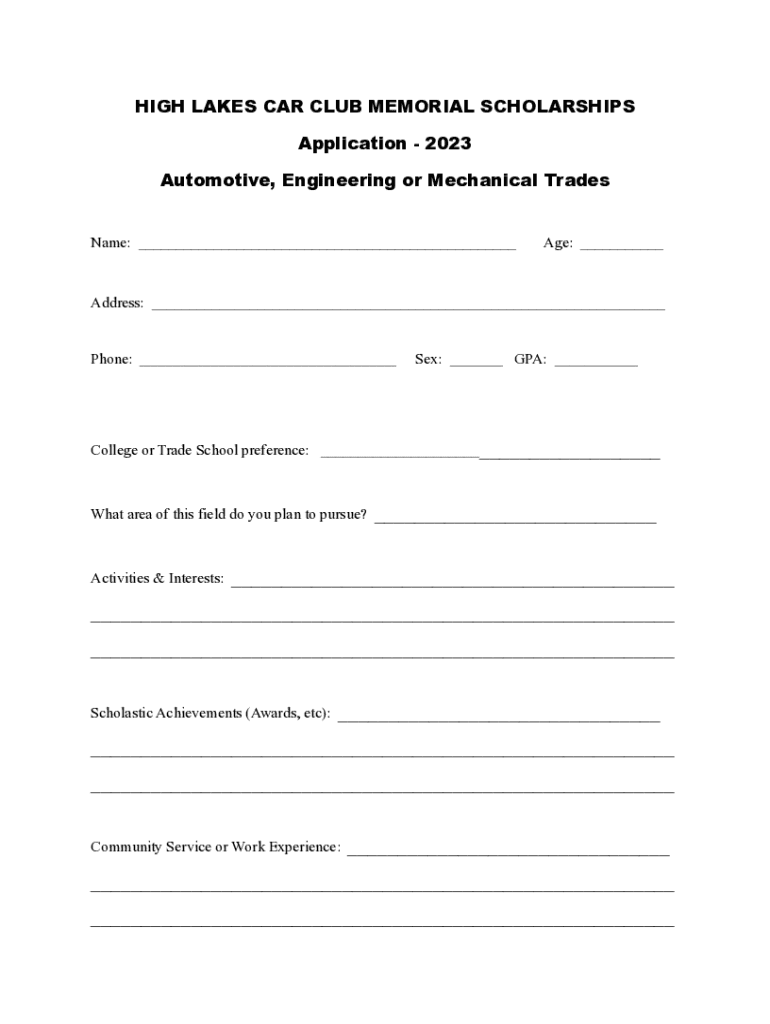 Application 2023 Automotive, Engineering or Mechanical Trades Name: ___Age: ___Address: ___Phone: ___Sex: ___ GPA: ___College or Trade School preference: ___What area of this field do you plan to