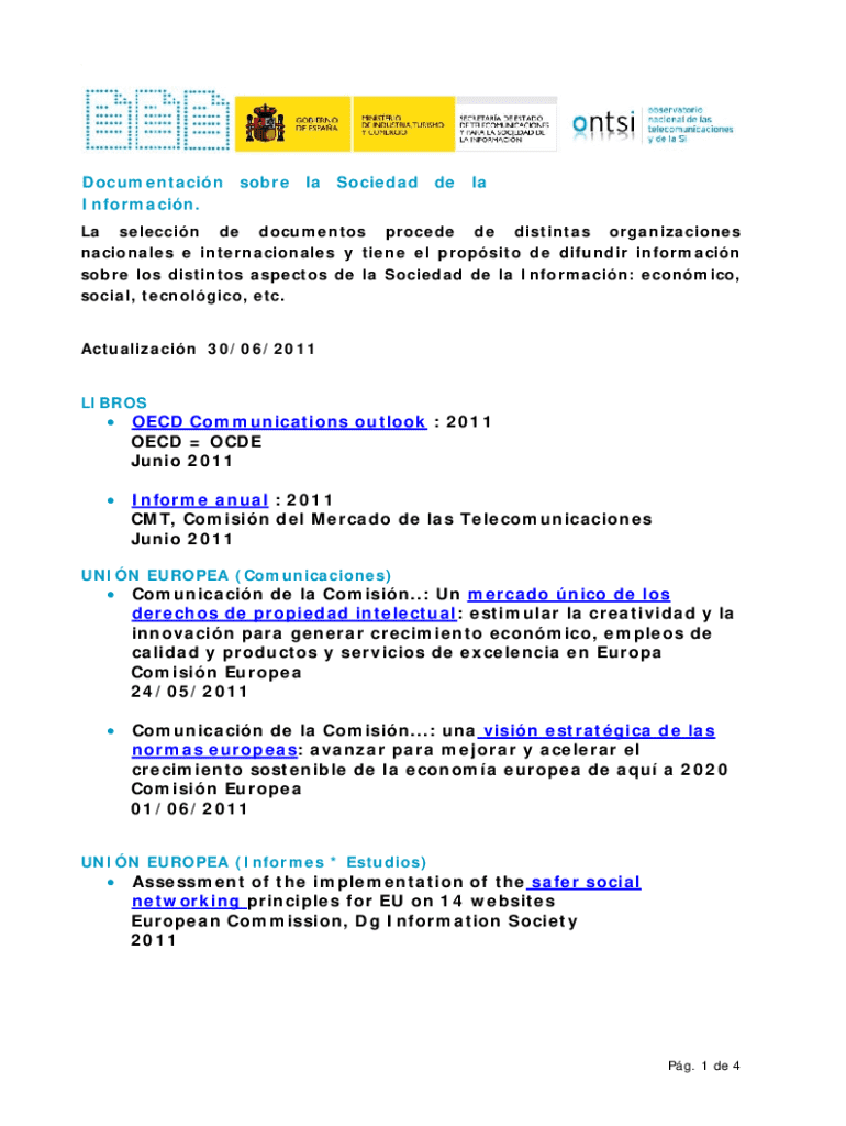 Documentacin sobre la Sociedad de la Informacin. La seleccin de documentos procede de distintas organizaciones nacionales e internacionales y tiene el propsito de difundir informacin sobre los distintos