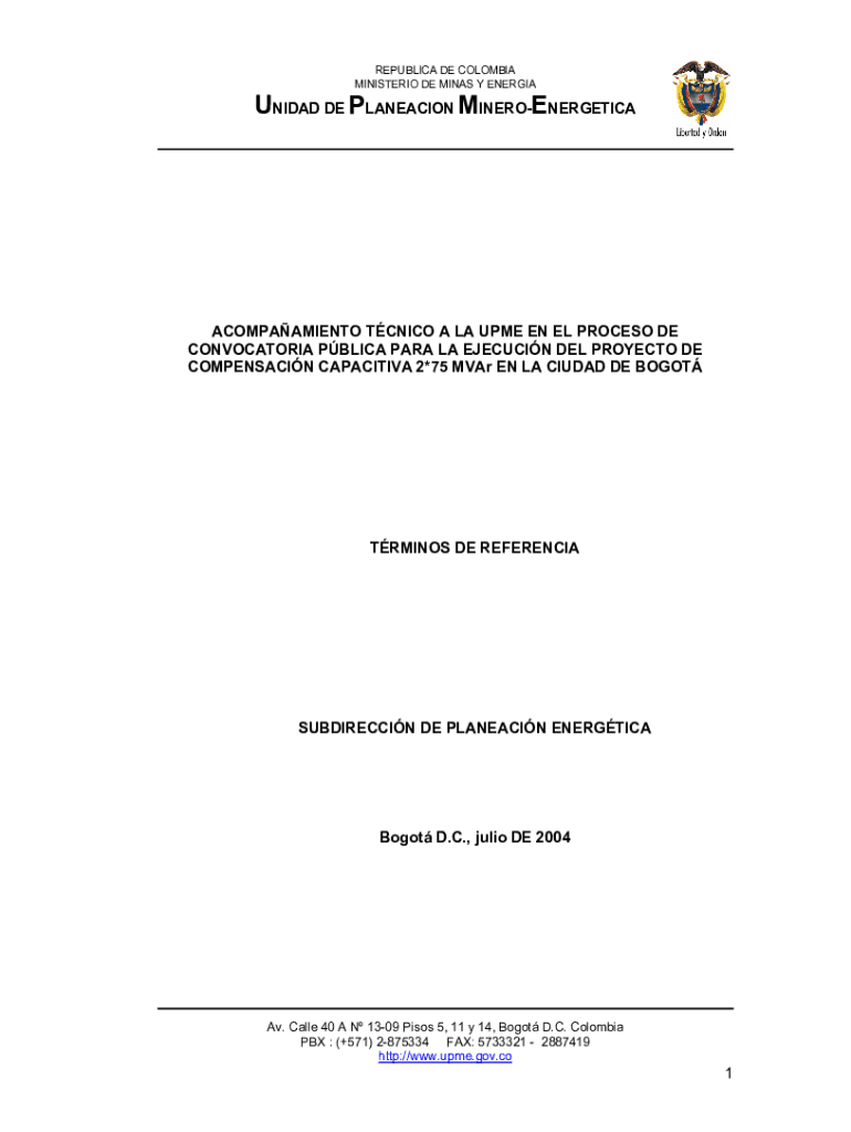 REPUBLICAN DE COLOMBIA MINISTER DE MINES Y ENERGIAUNIDAD DE PLANTATION MINEROENERGETICAACOMPAAMIENTO TCN ICO À la PME EN EL PROCESS DE CONVOCATORIA PBL ICA PARA LA EXECUTION DEL PROJECT DE COMPENSATION