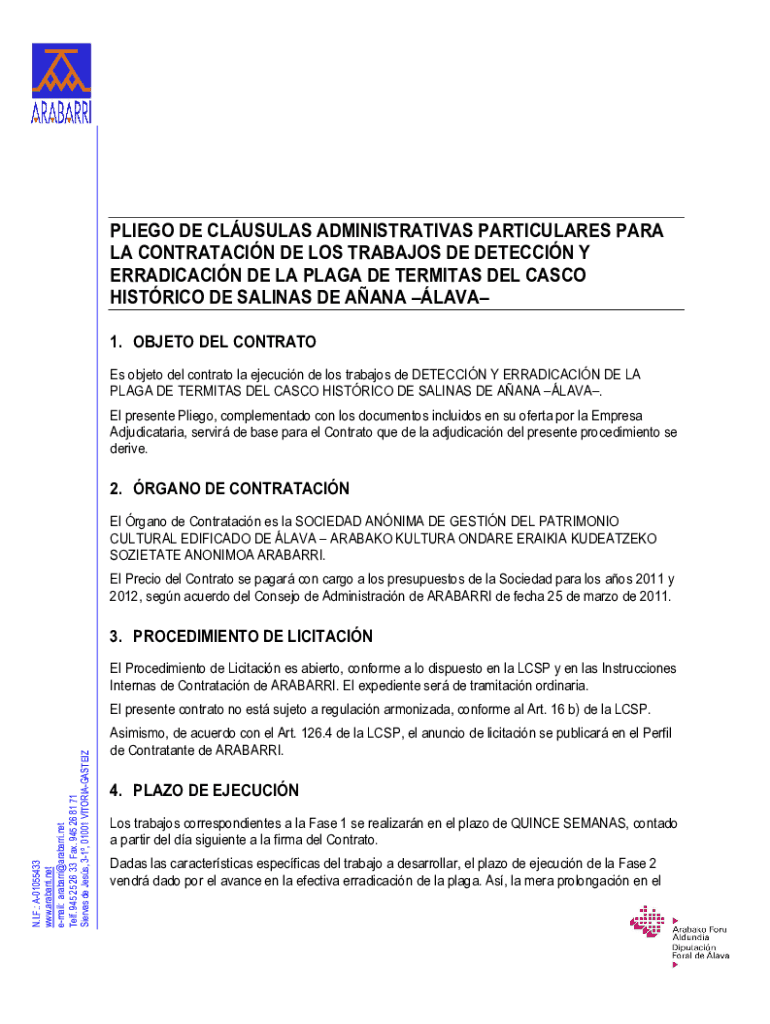 DIEGO DE CLUSTERS ADMINISTRATIVE PARTICULARS PARA LA CONTRATACIN DE LOS TABOOS DE DETECTION Y ERADICATION DE LA PLAZA DE TERMITES DEL CISCO DISTRICT DE SALINAS DE ANNA LAVA 1. OBJECT DEL CONTRALTO