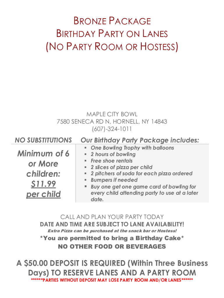 BRONZE PACKAGE BIRTHDAY PARTY ON LANES (NO PARTY ROOM OR HOSTESS)MAPLE CITY BOWL 7580 SENECA RD N, CORNELL, NY 14843 (607)3241011NO SUBSTITUTIONSMinimum of 6 or More children: $11.99 per children