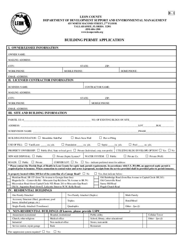 B1 LEON COUNTY DEPARTMENT OF DEVELOPMENT SUPPORT AND ENVIRONMENTAL MANAGEMENT 435 NORTH MACOMB STREET, 2ND FLOOR TALLAHASSEE, FLORIDA 32301 (850) 6061300 www.leonpermits.orgBUILDING PERMIT APPLICATION