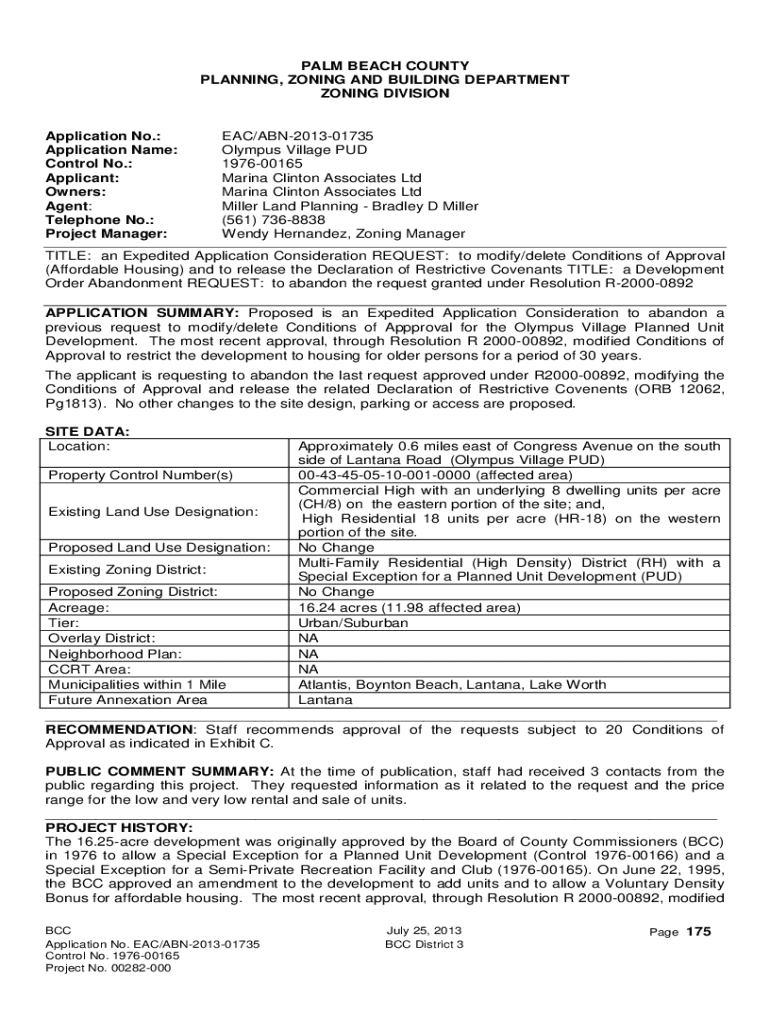 PALM BEACH COUNTY PLANNING, ZONING AND BUILDING DEPARTMENT ZONING Divisionalization No.: Application Name: Control No.: Applicant: Owners: Agent: Telephone No.: Project Manager:EAC/ABN201301735 Olympus