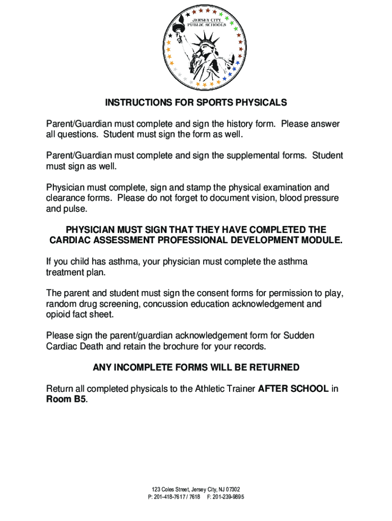 INSTRUCTIONS FOR SPORTS PHYSICALS Parent/Guardian must complete and sign the history form. Please answer all questions. Student must sign the form as well. Parent/Guardian must complete and sign the