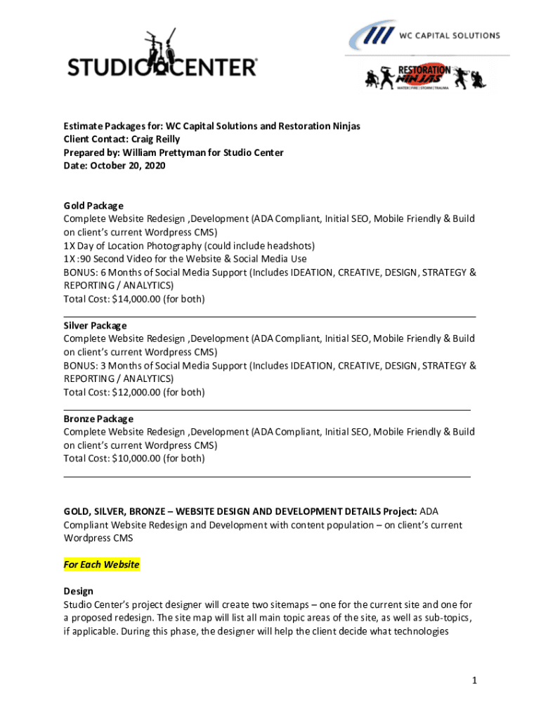 Estimate Packages for: WC Capital Solutions and Restoration Ninjas Client Contact: Craig Reilly Prepared by: William Pretty man for Studio Center Date: October 20, 2020, Gold Package Complete Website