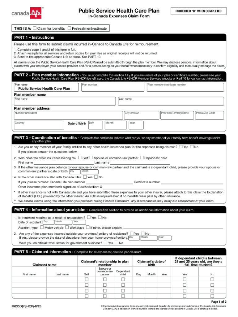 This document contains both information and form fields. To read information, use the Down Arrow from a form field. Public Service Health Care Unprotected B WHEN COMPLETEDInCanada Expenses Claim Form