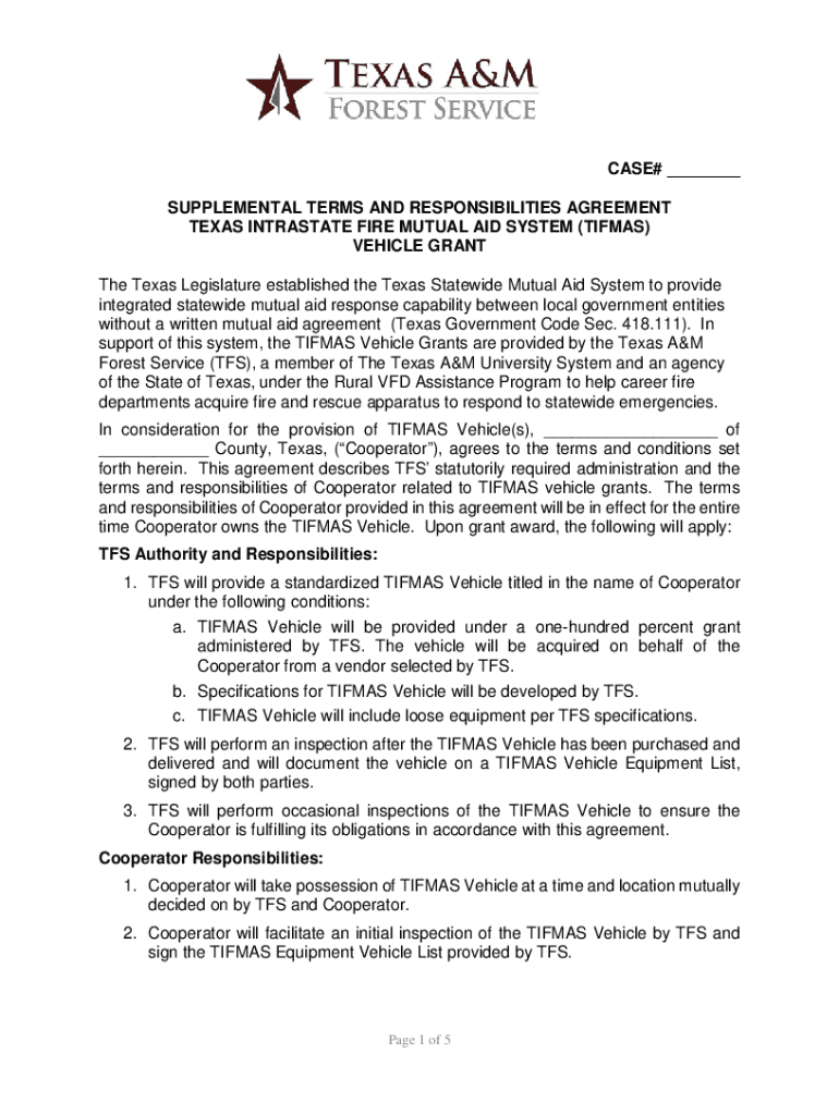 CASE# ___ SUPPLEMENTAL TERMS AND RESPONSIBILITIES AGREEMENT TEXAS INTRASTATE FIRE MUTUAL AID SYSTEM (TIMES) VEHICLE GRANT The Texas Legislature established the Texas Statewide Mutual Aid System to
