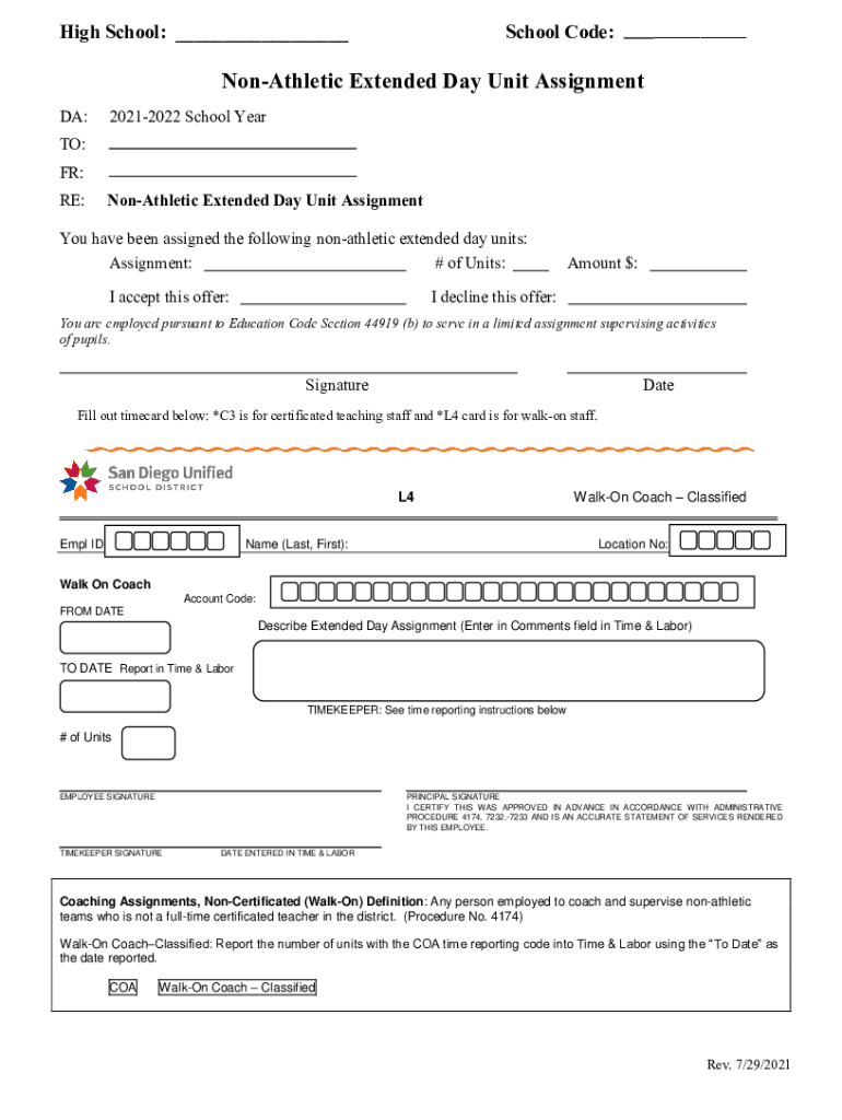 High School: ___School Code:___Nonathletic Extended Day Unit Assignment DA:20212022 School Pareto: FR: RE:Nonathletic Extended Day Unit Assignment have been assigned the following nonathletic extended