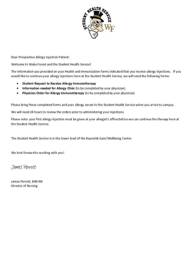 Dear Prospective Allergy Injection Patient: Welcome to Wake Forest and the Student Health Service! The information you provided on your Health and Immunization forms indicated that you receive allergy