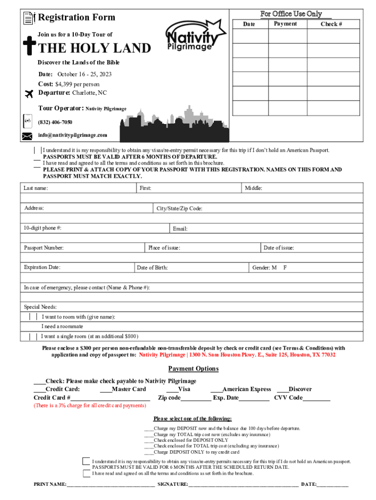 For Office Use OnlyRegistration FormDatePaymentCheck #Join us for a 10Day Tour the HOLY LAND
